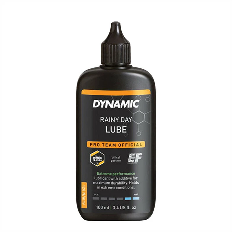 Das bevorzugte Kettenöl von unseren Profiteams für Tage mit Dauerregen: Dynamic Rainy Day Lube.Das High-Tech Schmiermittel wurde entwickelt, um sehr lange unter extrem nassen Bedingungen perfekt zu arbeiten. Die perfekte Rezeptur dieses Schmierstoffs lässt deine Kette geschmeidig arbeiten, obwohl sie dauerhaft der Nässe ausgesetzt ist. Im Vergleich zu herkömmlichen Nass-Schmierstoffen behält das Dynamic Rainy Day Lube seine Schmiereigenschaften über einen längeren Zeitraum und schütz zusätzlich perfekt gegen Rostbildung. Durch die hohe Kriechfähigkeit des Öls, dringt es tief in jedes Kettenglied ein, um eine perfekte Schmierung und einen hohen Schutz für die Kette zu garantieren.Um die besten Eigenschaften des Dynamic Rainy day Lube nutzen zu können, verwende es am besten nach der Reinigung der Kette mit dem Dynamic Chain Cleaner. Nach dem Reinigungsvorgang öle alle Kettenglieder und beweglichen Teile deines Fahrradantriebs.