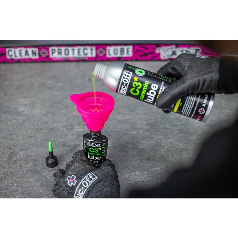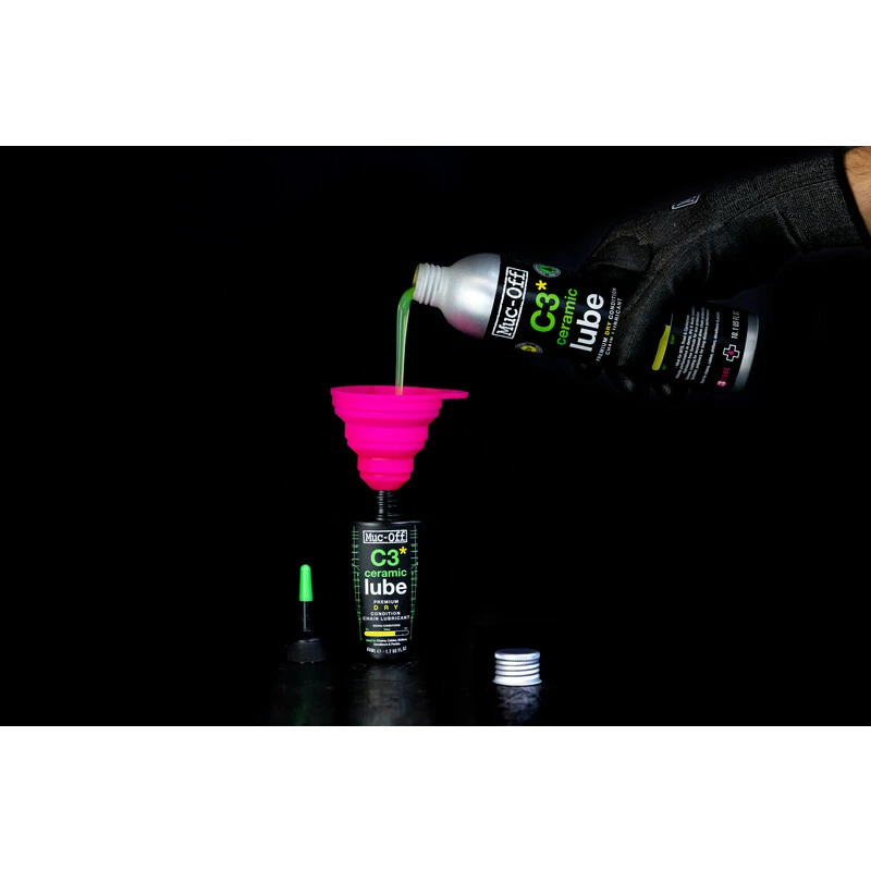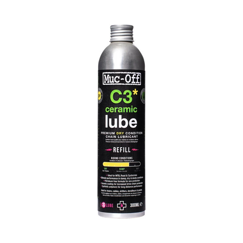 C3 Dry Ceramic Chain Lube setzt neue Massstäbe, wenn es darum geht, diedie ultimative Schmierung. Es bietet vollständigen Korrosionsschutz undunvergleichliche Leistung bei trockenen, staubigen und feuchten Bedingungen. MitNano-Keramikpartikeln und synthetischen Polymeren maximiert das C3 DryCeramic Chain Lube Ihre Leistung, indem es den Kontakt von MetallMetall-zu-Metall-Kontakt auf ein bahnbrechend niedriges Niveau und bietet bis zu10-mal mehr Leistung als herkömmliche Kettenöle und -schmierstoffe. DasMuc-Off F&E-Team hat definitiv nicht an der falschen Stelle gespart, als es dieZukunft der Fahrradschmierstoffe auf den Weg brachte.In der Tat hat unser Team dafür gesorgt, dass das C3 Dry Ceramic Lube sicher ist, indem eseine biologisch abbaubare, erdölfreie Formel entwickelt, damit Sie sich keineum sich selbst, Ihr Fahrrad oder den Planeten sorgen müssen.Unsere 300-ml-Nachfüllflasche besteht zu 50 % aus PCR-Aluminium, sie ist die bestedie beste Wahl für alle, die viel fahren